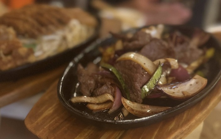 Gerichte auf heißer Platte und mit Duftreis serviert